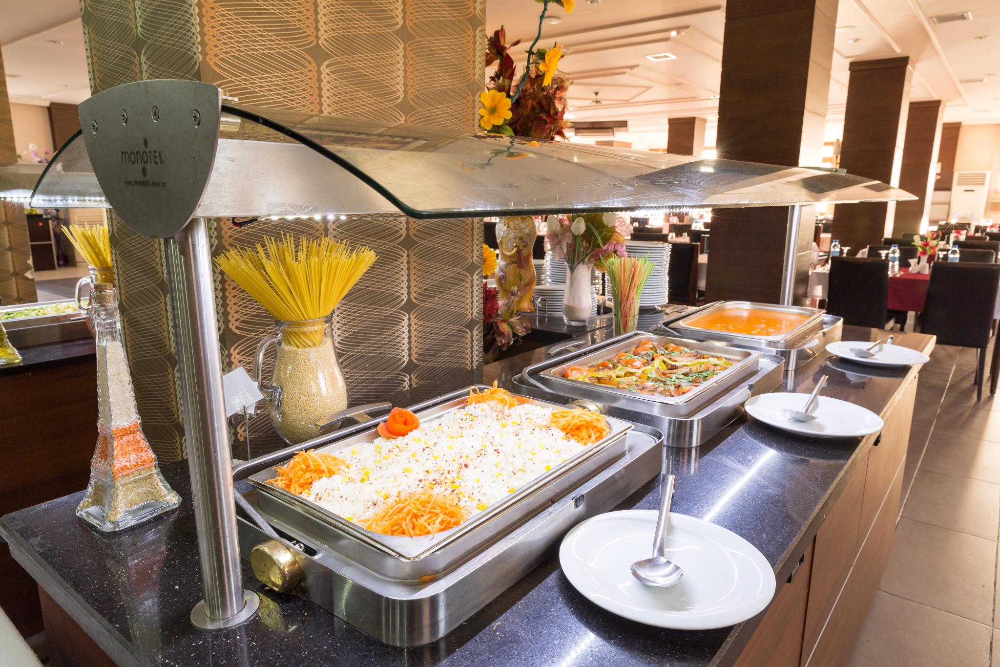 Yarım pansiyon konseptinde çalışan otelimiz, sabah açık büfe kahvaltı, ve akşam açık büfe yemek vermektedir. Alan içerisinde toplamda 5 farklı restoranımız mevcuttur. Bunlardan biri de Alakart olarak çalışan bir restorandır. Gün boyu buradan da Sulu Yemek-Kebap-Pide gibi çeşitli ürünleri temin edebilirsiniz.